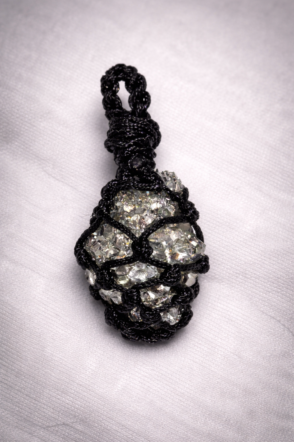 a natural Pyrite stone pendant, intricately wrapped in handcrafted black macramé. The stone features a cluster of raw Pyrite crystals, known for their distinctive metallic luster and pale gold to brassy tones that shimmer under light.
